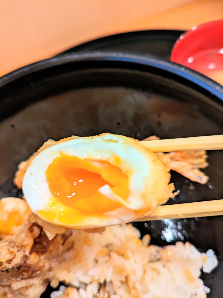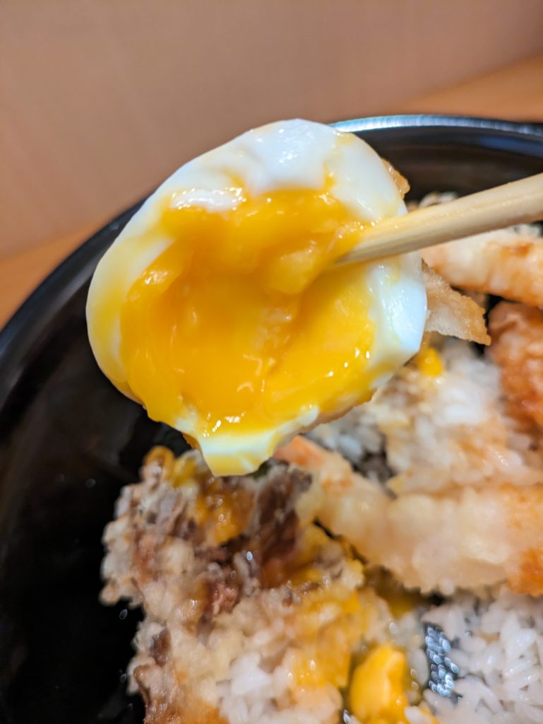 存在感ある海老🦐が3尾ものっていて海老好きにはたまりません♪外はサクサク中はぷりっぷり♪舞茸は香り豊かで鶏はやわらかくてジューシー♪ブロッコリー🥦とさつまいも🍠は甘く茄子は程よく油を吸ってとろっとしていて何と言っても半熟卵🥚の半熟加減が絶妙で少し崩しながらまた一口入れるとまろやかで食べてて飽きのこない思わず✨笑顔✨になってしまう大満足の逸品でした♪😋✨(鶏・ブロッコリー・茄子・卵・ご飯は鳥取県産)