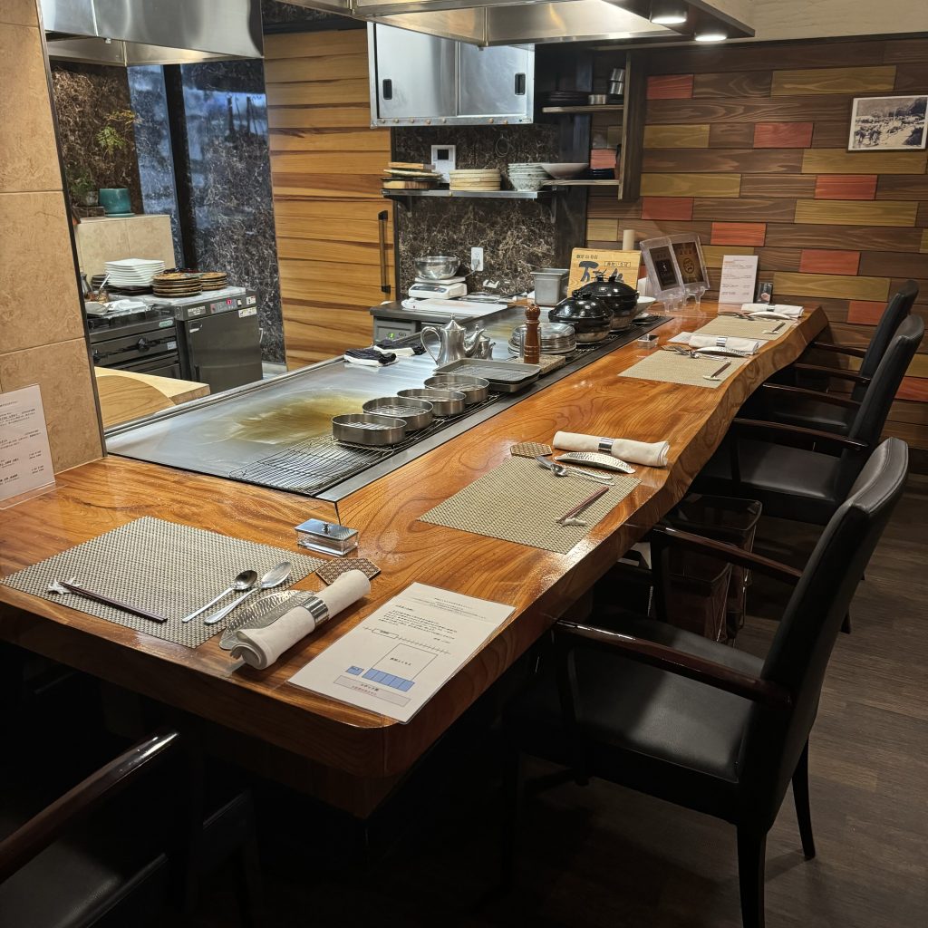 店内には大きなカウンター席。そしてドンと存在感のある鉄板。ここで極上のこだわりお料理たちが生まれるのだと思うと胸が高鳴ります。木材を基調とした温かく落ち着いた雰囲気の内装。家具も統一されていて、お洒落です。これは会話に花が咲きそうです♪