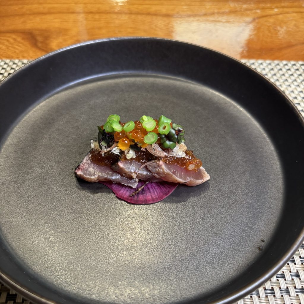 はじめは前菜。表面を炙った境港産のカツオの上にいくらとみょうが、インゲン、スプラウトを乗せて。