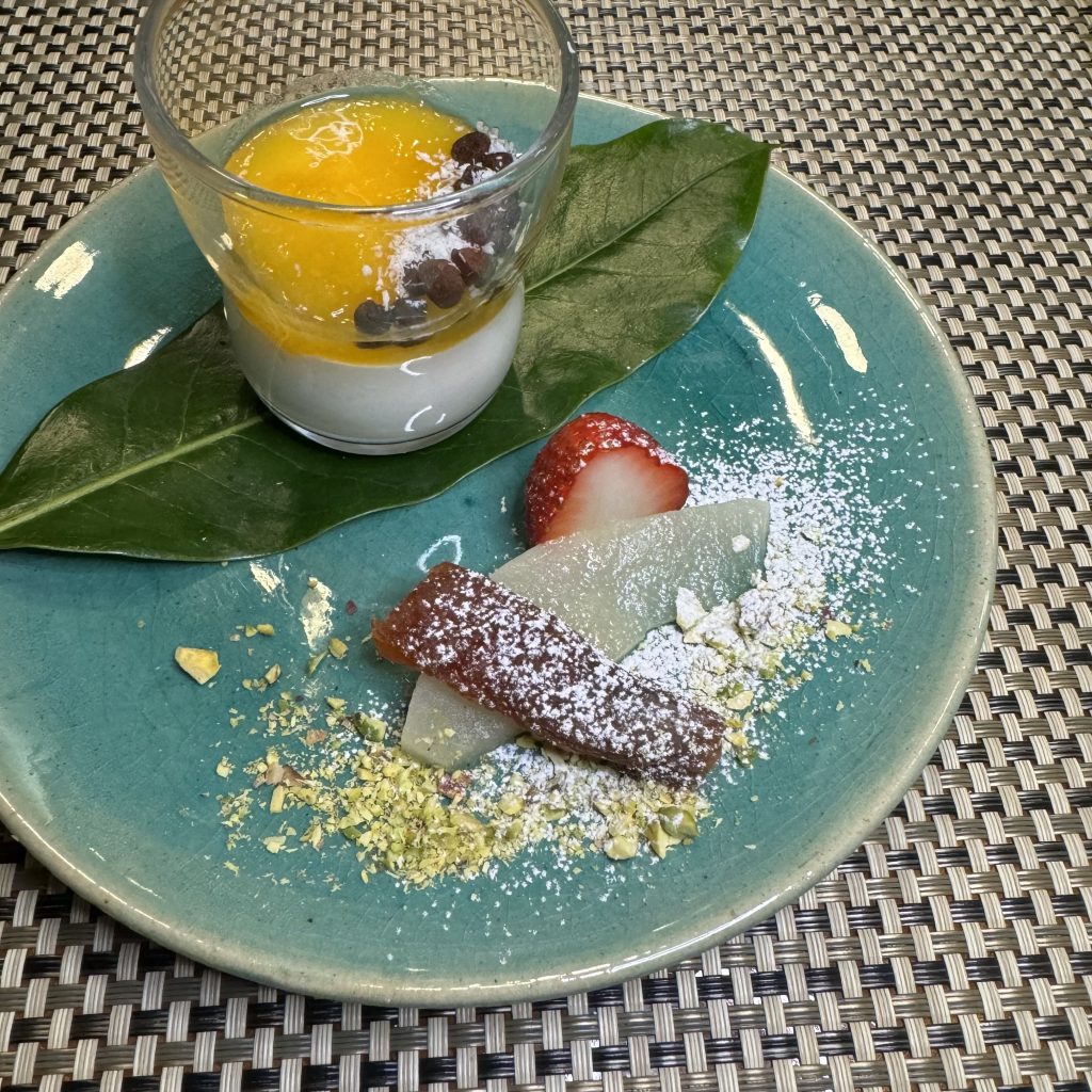 デザートは練乳のムース、地元金柑のソース、チョコのクランブル。自家製の干し柿と洋梨のコンポートにピスタチオをかけてお洒落に。