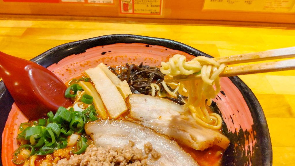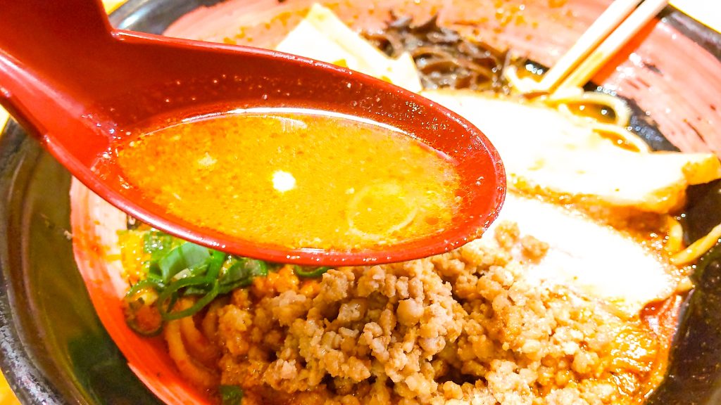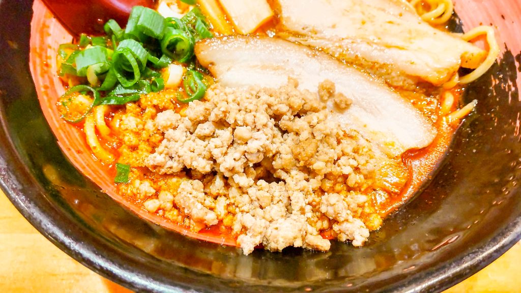 ゴマがフワッと香る唐辛子の効いたスープに自家製の豚ミンチをトッピングし、辛さを引き立てる甘さがアクセントにっ