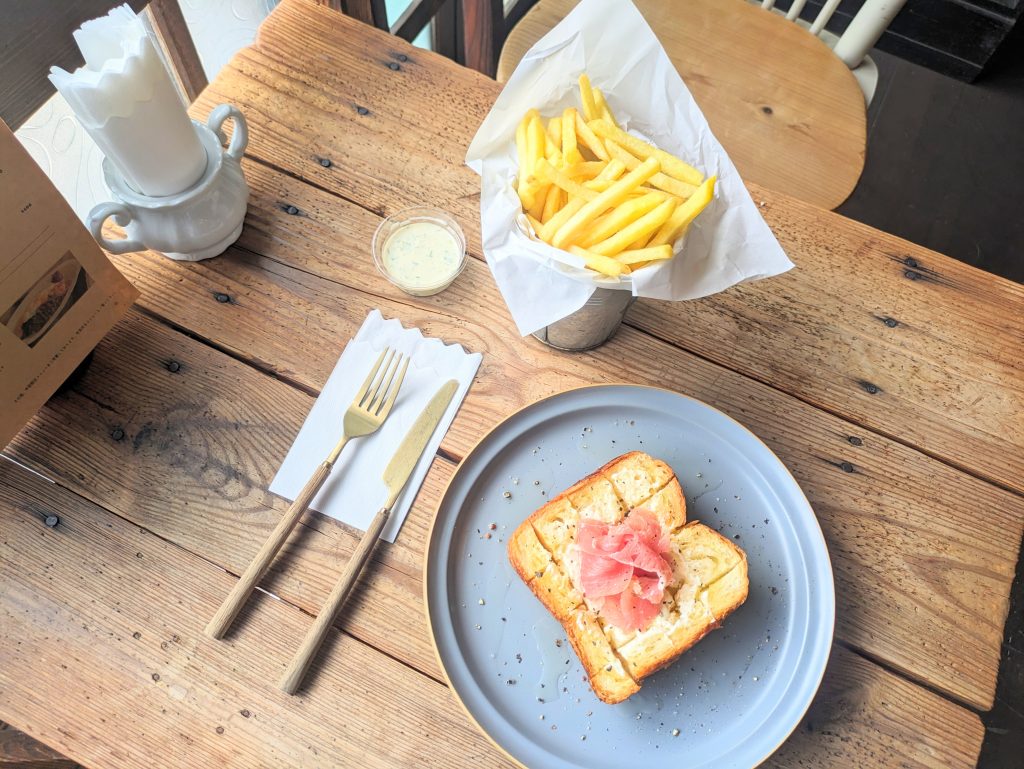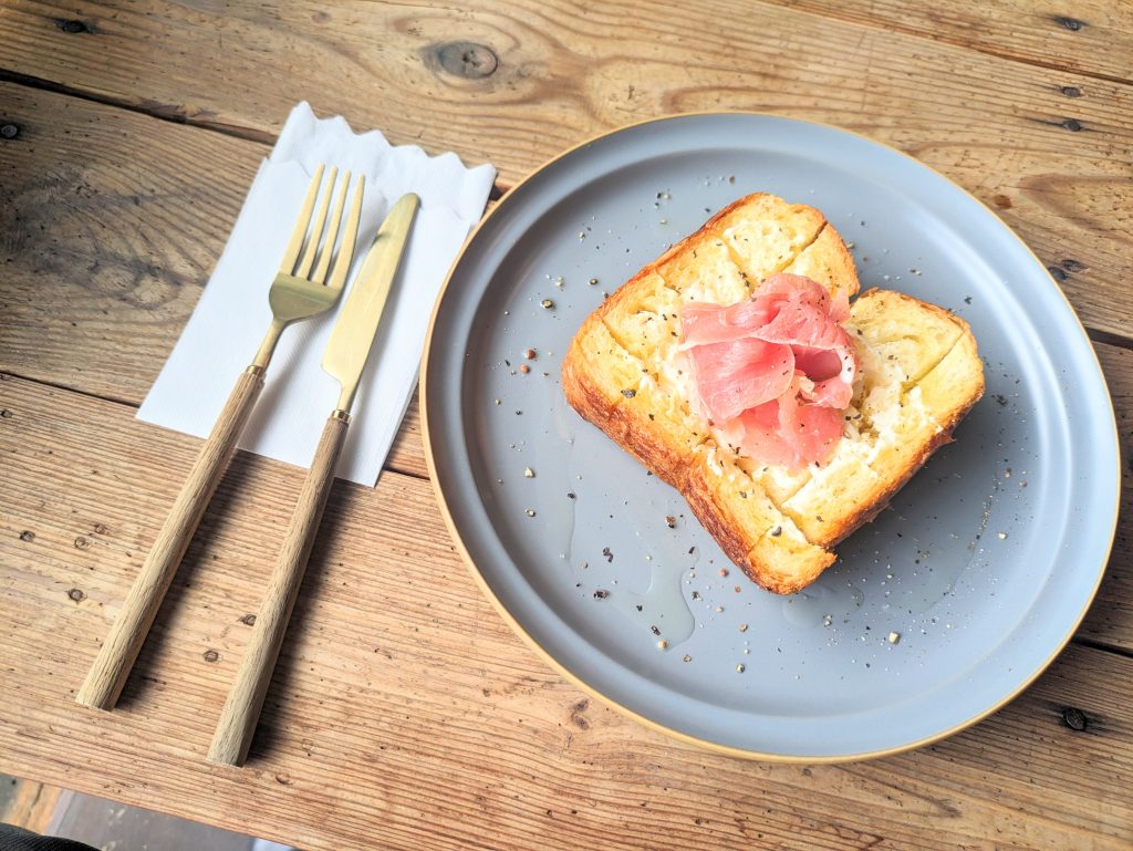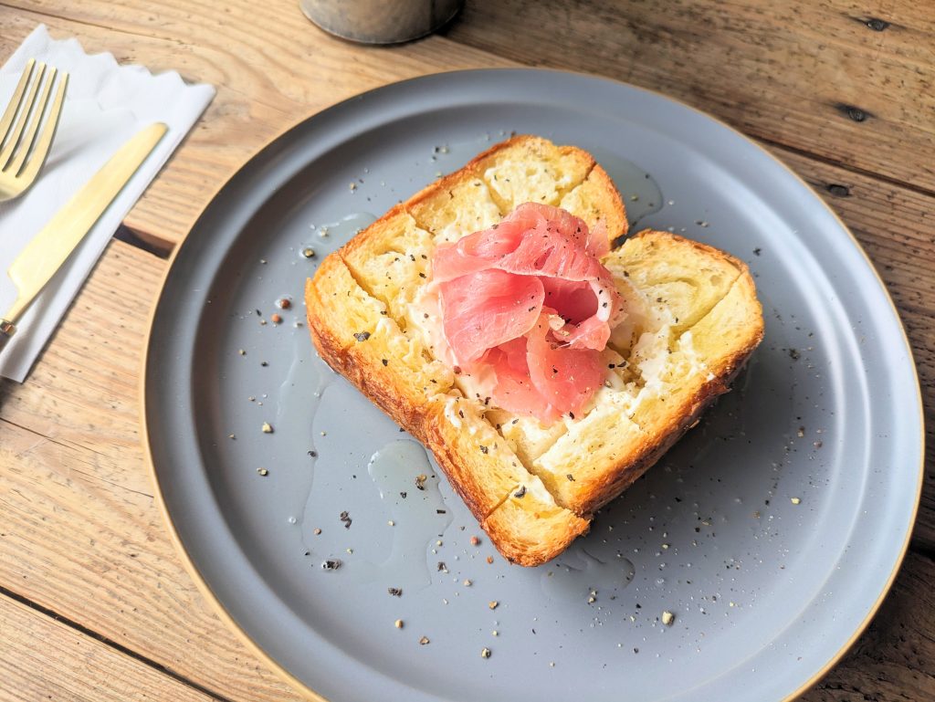 サクッと香ばしいデニッシュ食パン🍞に生ハム×サワークリームがトッピングされていて、生ハムの塩味とサワークリームのやさしい酸味が絶妙なバランスで食べていて幸せな気分にさせてくれる逸品でした♪✨ちょっとしたごはんの代わりやおやつタイムにもオススメですよ♪✨