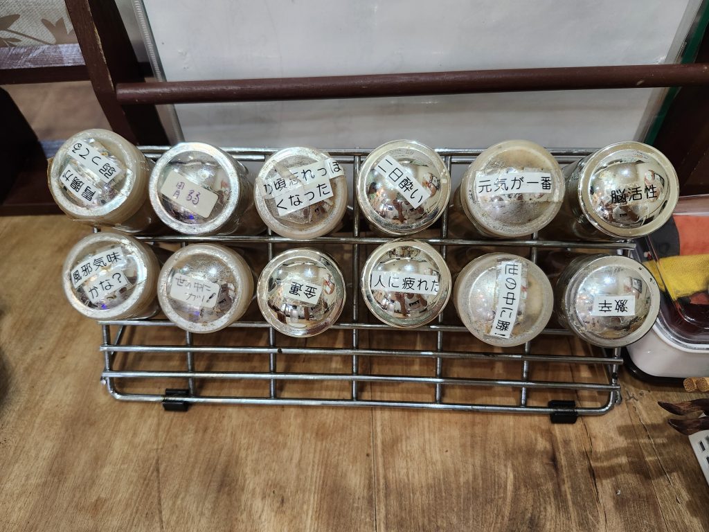 机にはお好みでかけられるスパイスが12種類も置いてあり、食べながら味の変化を楽しむことができます。