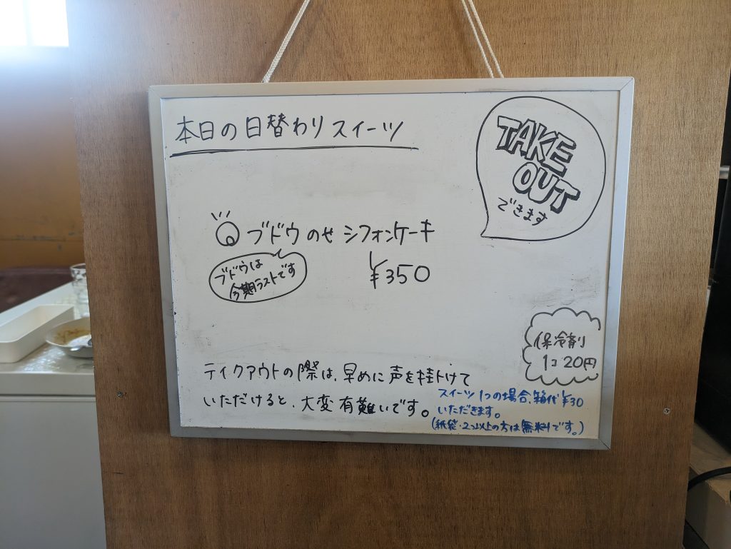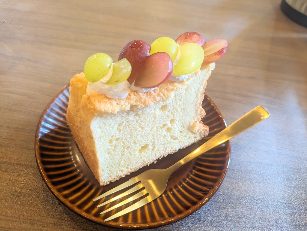 本日の日替わりスイーツは毎日違うスイーツが楽しめます。この日頂いたのは🍇ブドウのせシフォンケーキ🍇きめ細やかなふわっふわのシフォンケーキの上に地元(智頭)のぶどう🍇がトッピングされていてやさしい甘さのシフォンケーキと甘みのしっかりしたぶどう🍇とのバランスが絶品でした♪✨