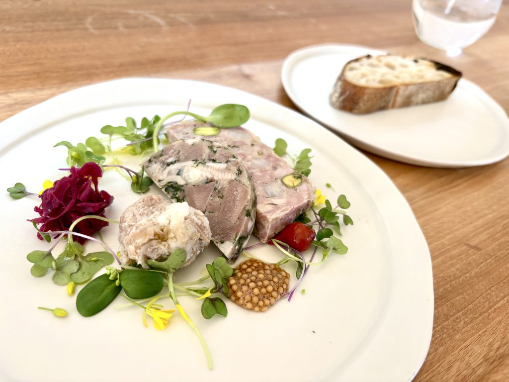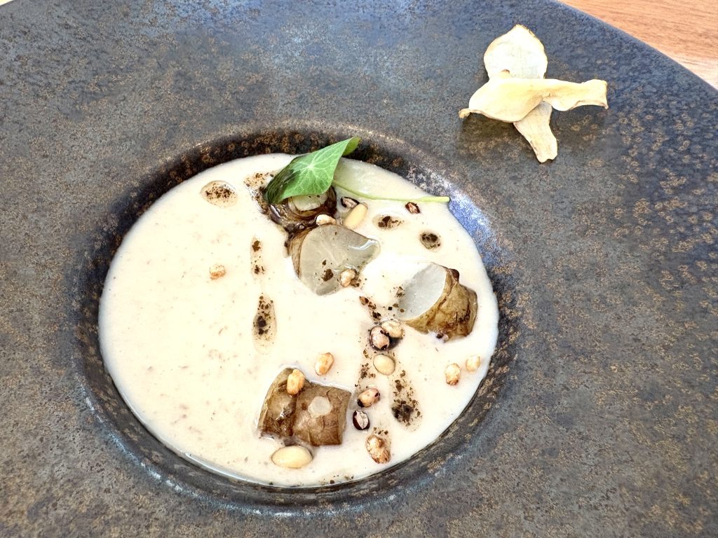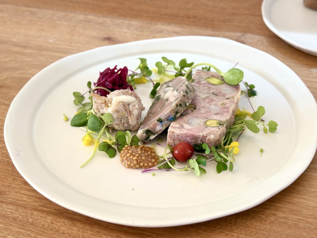 フランス語でテリーヌやリエット、ゼリー寄せ等加工したものをシャルキトリーと言うそうです。お次は、菊芋のポタージュ。すべてに有機で育てたお野菜や花が散りばめられて、まるで高貴な人になったような気がしましたよ。
