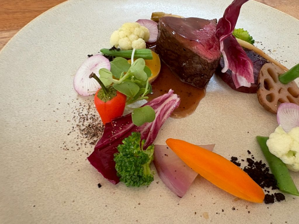そしていよいよメイン。こちらも野菜のリース。大山で育った牛の肩サンカク。程よい歯ごたえに心地よいさっぱりとした脂。もうね、噛めば噛むほど旨味があふれて飲み込みたくない!ずーっと噛んで味わっていたいと名残惜しくなりました。