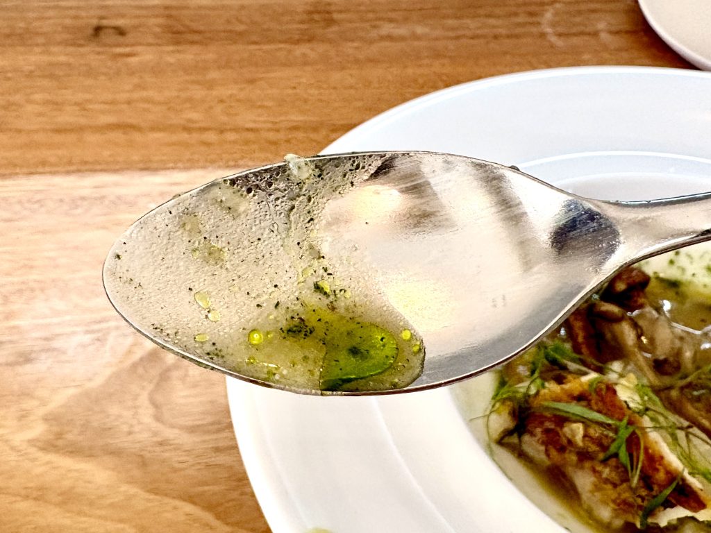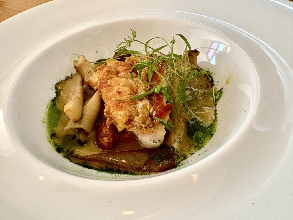 次のお皿は、こちらも地元境港産の甘鯛。皮はもちろんパリパリ、天然のキノコのソテーにソースは魚介などを使ってサフランやオリーブオイルにセルバチコを使い鮮やかなグリーン。ほうれん草のパウダー等もうね、食べていて食事は養生だわと感じて元気になっちゃいました。