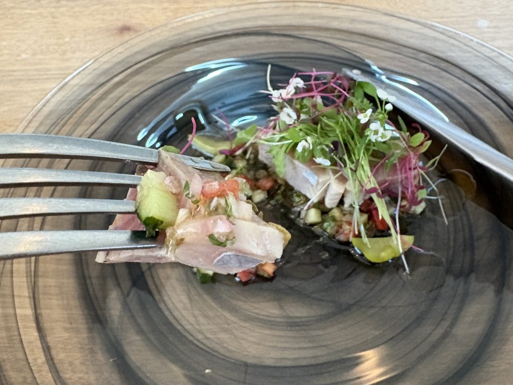 まずは前菜。境港で上がった鰹のマリネ。目の前に運ばれたお皿を見た時、「え?これ花のリースですか?」と思っちゃいました。もう美しくて見とれましたよ。ええ、もちろんすぐにいただきました。涼やかなお皿の上に藝術品の様なマリネ、その上に鰹と極上の野菜たち、おいしいと体が喜びます。