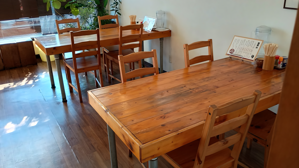 店主の気遣いやセンスが感じられる店内。4人掛けのテーブル席が2つと、対面カウンター席があります。待合用の椅子も店内に。カウンター席は対面式ですが、箸置きやおしぼり、ティッシュなどが程よい目隠しとなり、向かいのお客様と目が合うことはありません。おひとり様でも、ご家族やご友人とでも、心地よくお食事をお楽しみいただけます。