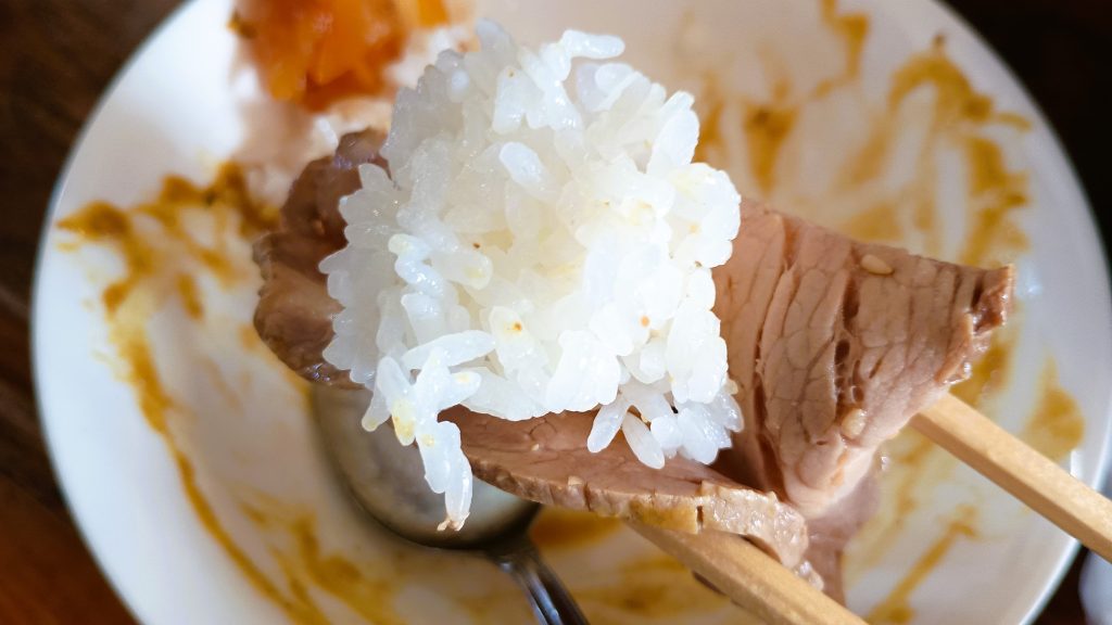 カレーは後から追加されたメニューかと思いきや、実は店主がカレーラーメン好きで、オープン当初からメニューにあるとのこと。ラーメンのスープをベースに使ったカレーは極上の美味しさで、ほろほろと煮込まれたお肉も嬉しいポイント。お店をよく知る常連のお客様にカレーセットを注文される方が多いのも納得です。見た目はトロっとしていて、なかなかのスパイシーさ。食べ進めるうちに汗が噴き出しますが、辛さの中にもコクのある後味が絶妙。お米は鳥取県産の「きぬむすめ」を使用。