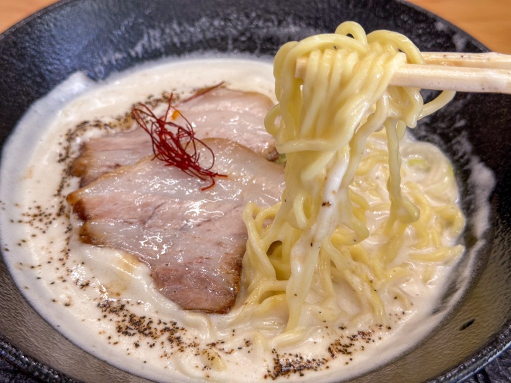 白湯ラーメンはクリーミーでコク深く、最後まで飲み干したくなる味😍