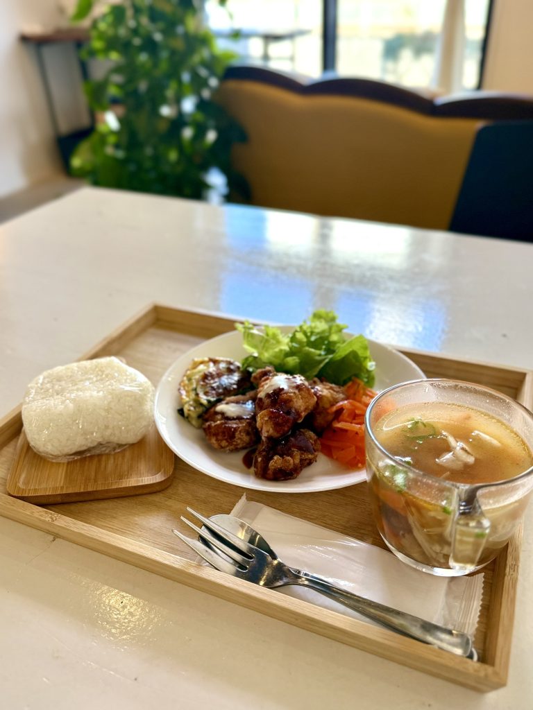 今回いただいたのは、おむすび+好きなスープ1杯に色とりどりのおかずが添えられた