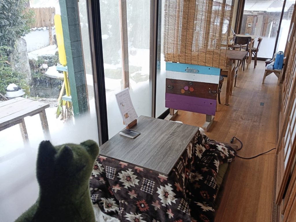 縁側の大きな窓から景色を眺めながらコタツでぬくぬく…思わず長居したくなる、最高の癒やし空間だわん。