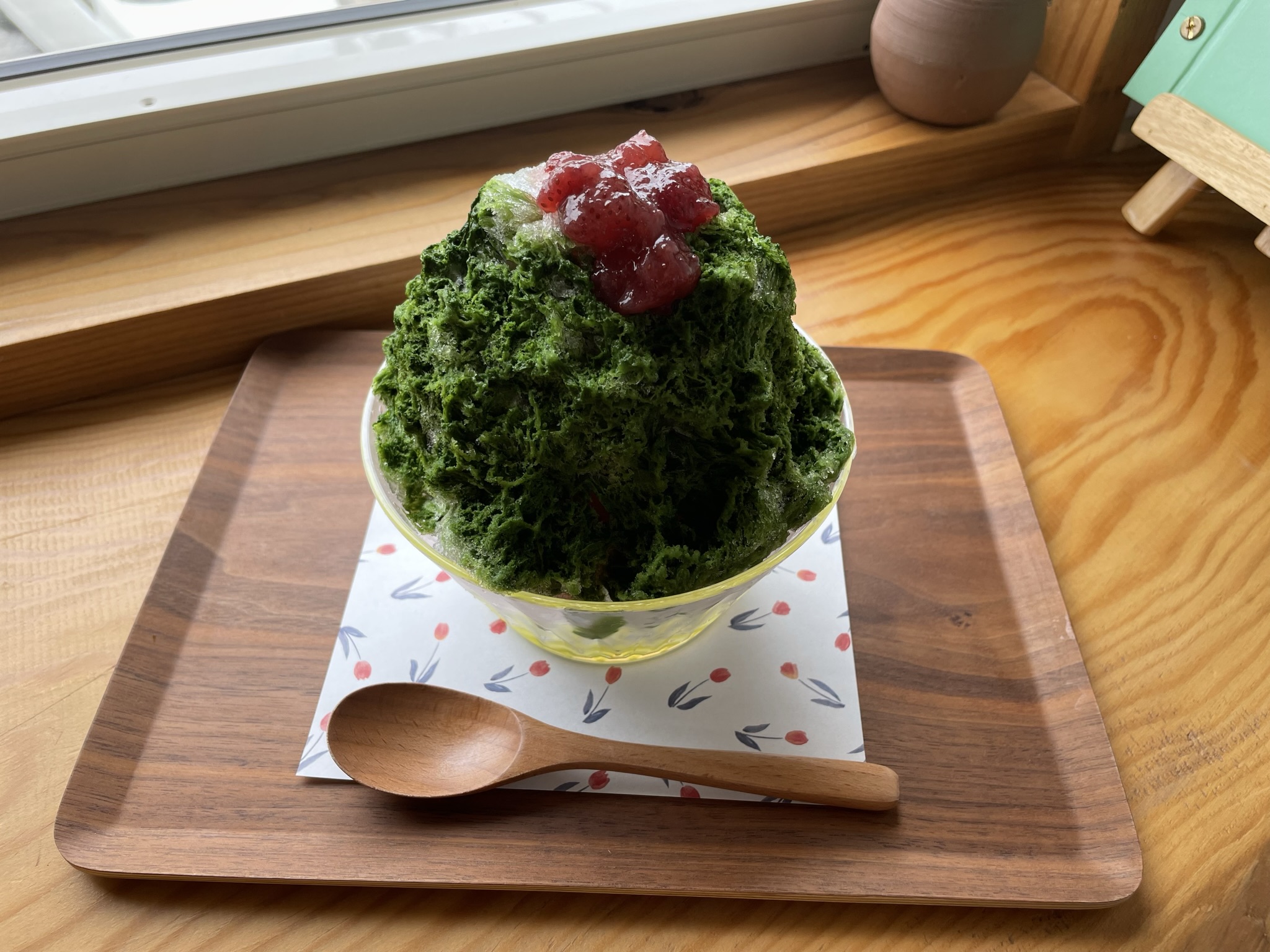 イチゴのシロップ漬けが乗った抹茶のかき氷です🍧